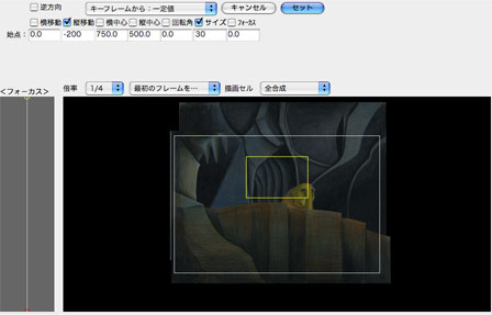 前にもビコーの動きをつける場面でも紹介しましたが、複数の原画をセルへ加工したものを画面に並べ、『こう動いて欲しい』という演出をします。