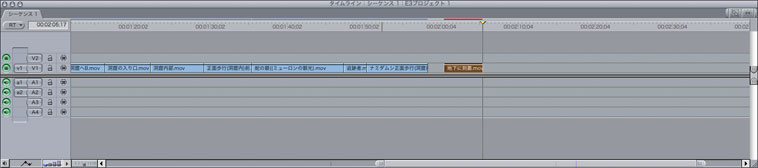二枚目の写真は、いよいよ映像編集ソフトを使って、作ったシーンを繋ぎ合わせていきます。映像編集のソフトは様々あるようですが、Artmic8neoの場合は《Final cut express》というソフトを使ってます。この上に《Final cut pro》というのがありますが、現段階(僕の映像制作の場合)では編集に於いてそこまで高度な機能は必要ありません。何故なら、通常の実写編集と違って『原画ありき』の映像を作っていますので、一つのシーンを完成した段階で既にある程度の演出処理は施してあるからです。